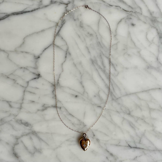 Victorian 9ct Gold Puffy Heart Pendant Necklace Featuring An Old-Cut Diamond