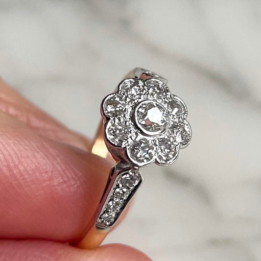 Art Deco 18k Gold, Platinum and Old European Cut Diamond Antique Flower Ring
