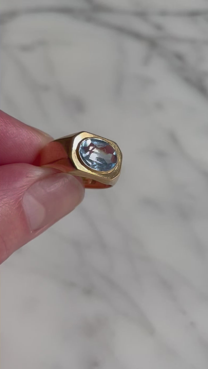1950s Geometric 18ct Gold Ring Featuring a Large Oval Aquamarine Stone