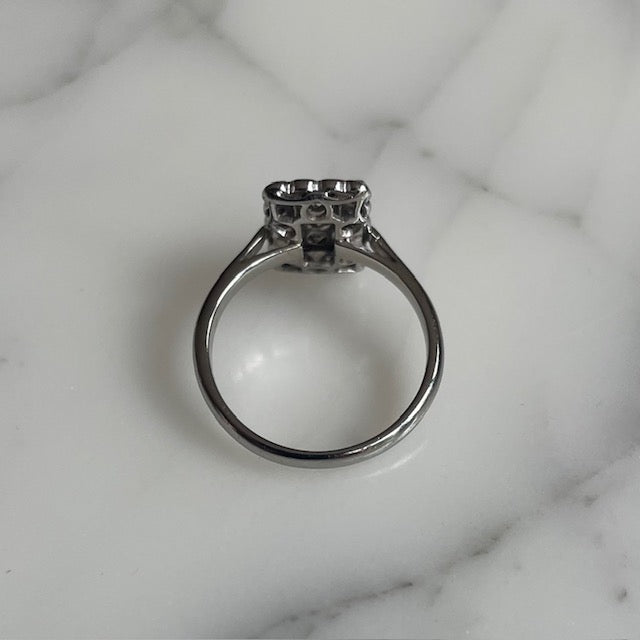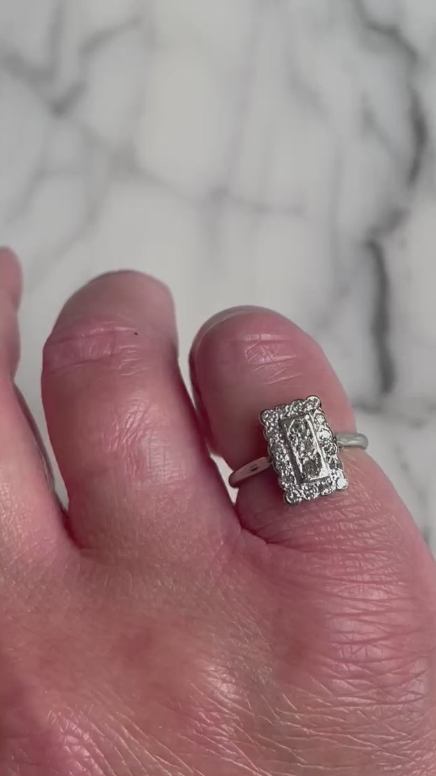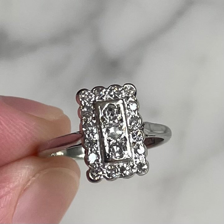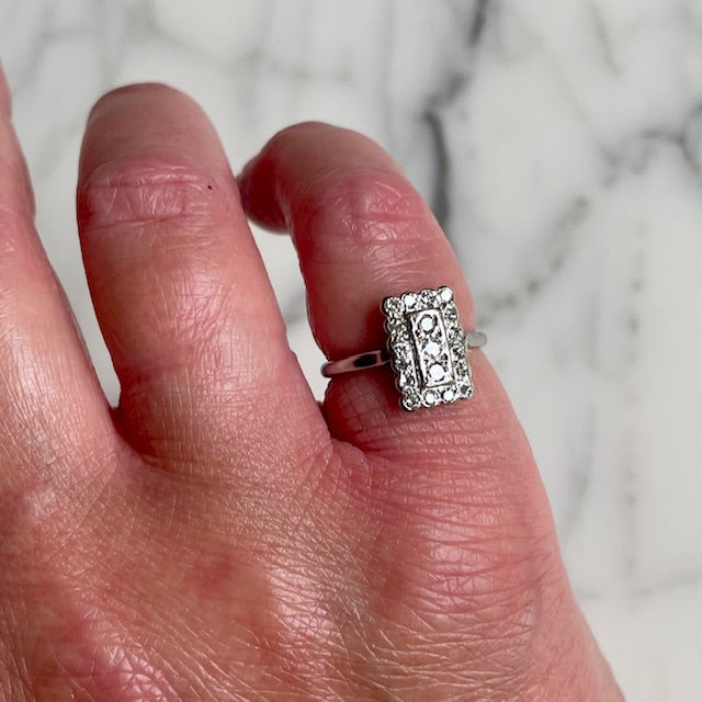A striking example of Art Deco design, this exquisite ring is crafted from platinum and 18k white gold. Nineteen old-cut diamonds are meticulously set in a refined rectangular arrangement, showcasing the timeless glamour of the 1920s with a fresh, modern edge.