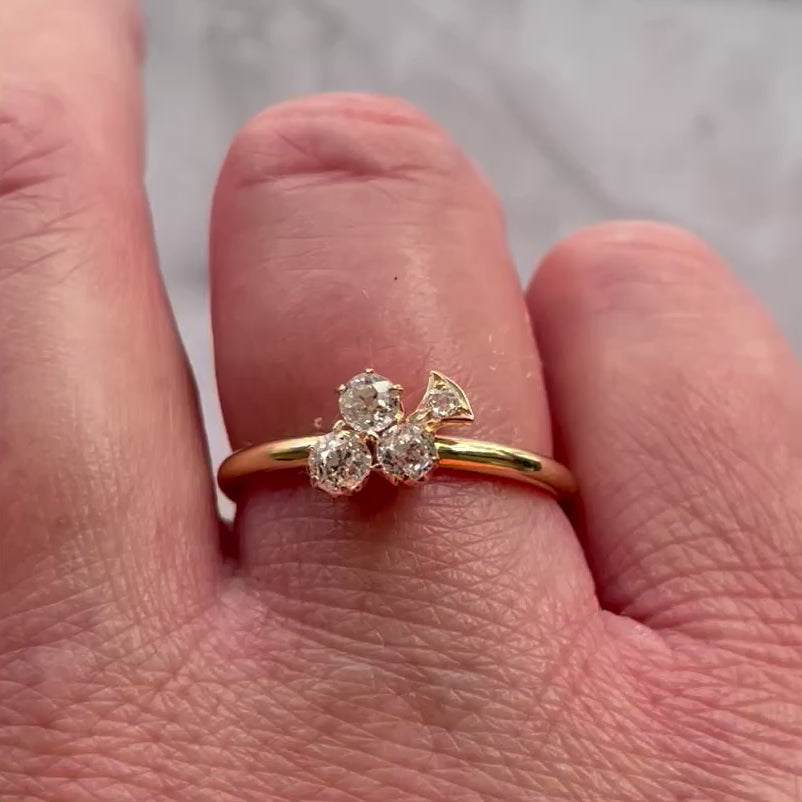 This exquisite antique ring features a sparkling clover motif formed from old cushion cut diamonds, totalling approximately 0.40 carats. Originally crafted in early 20th-century Spain as a stick pin, it has been thoughtfully reimagined by our skilled bench jeweller into a beautiful and wearable 18k gold ring—seamlessly blending antique charm with contemporary elegance.