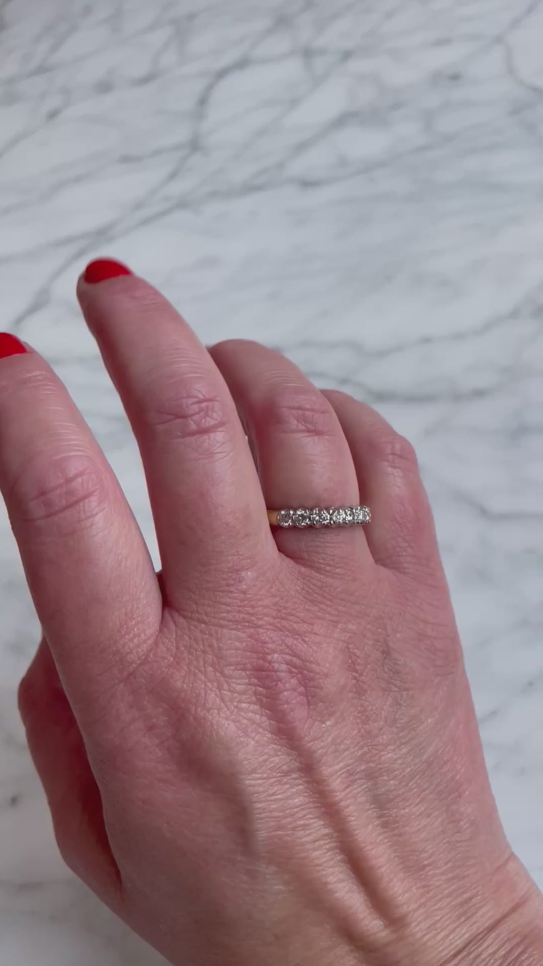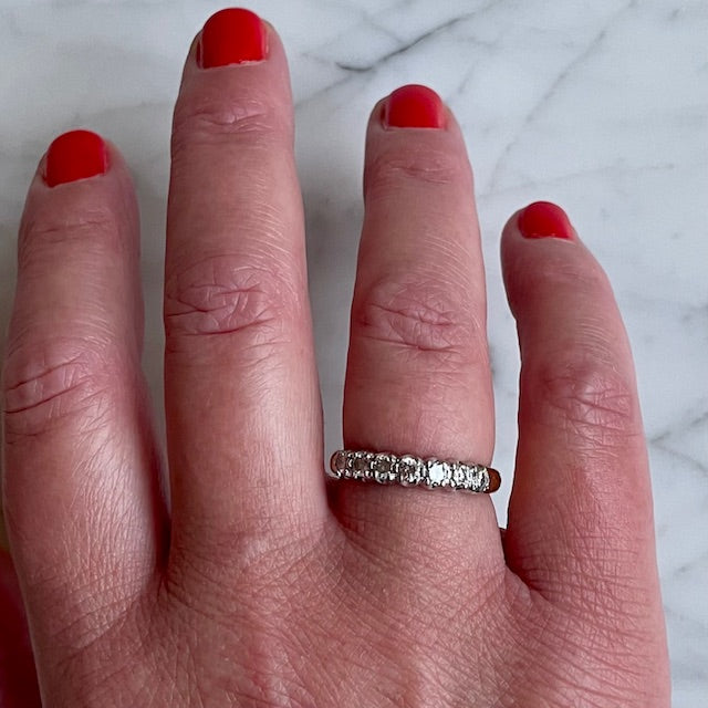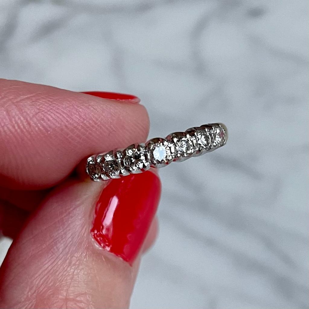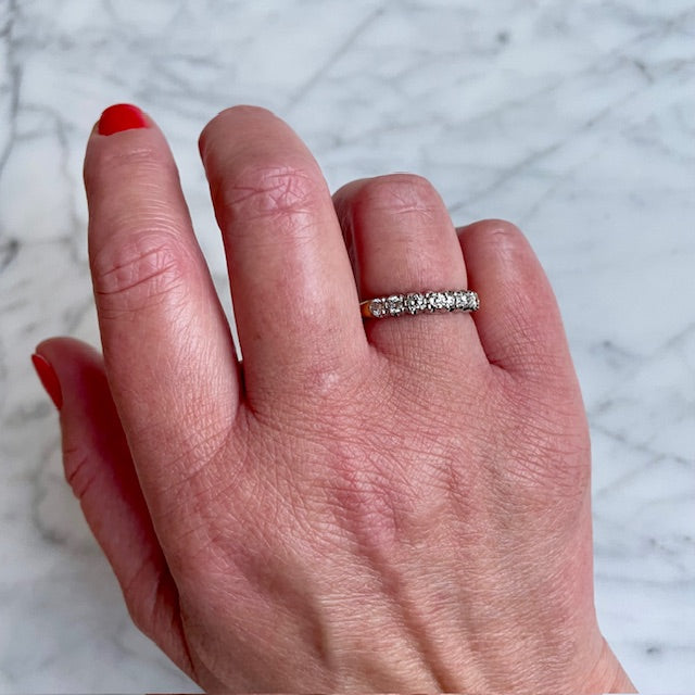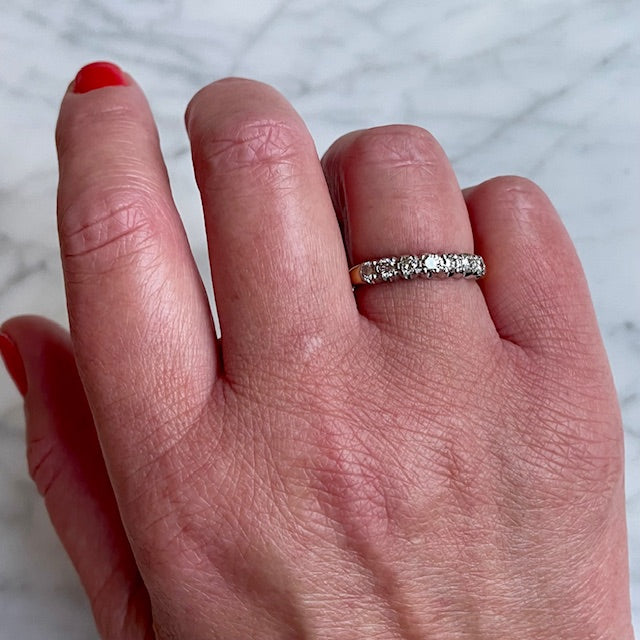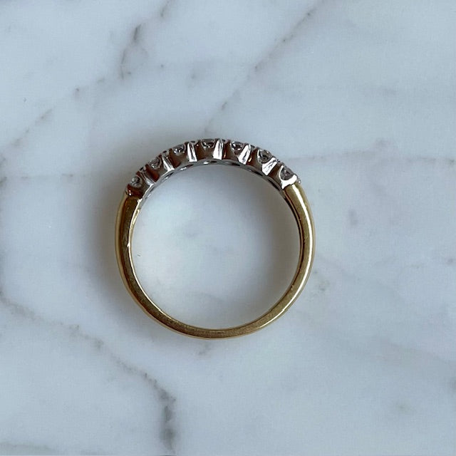 A timeless vintage half eternity band, beautifully crafted with seven brilliant-cut diamonds, renowned for their fiery sparkle. The diamonds are set in lustrous 18k white gold, complemented by a warm 18k yellow gold shank. With an approximate total diamond weight of 0.55 carats, this piece radiates refined sophistication.